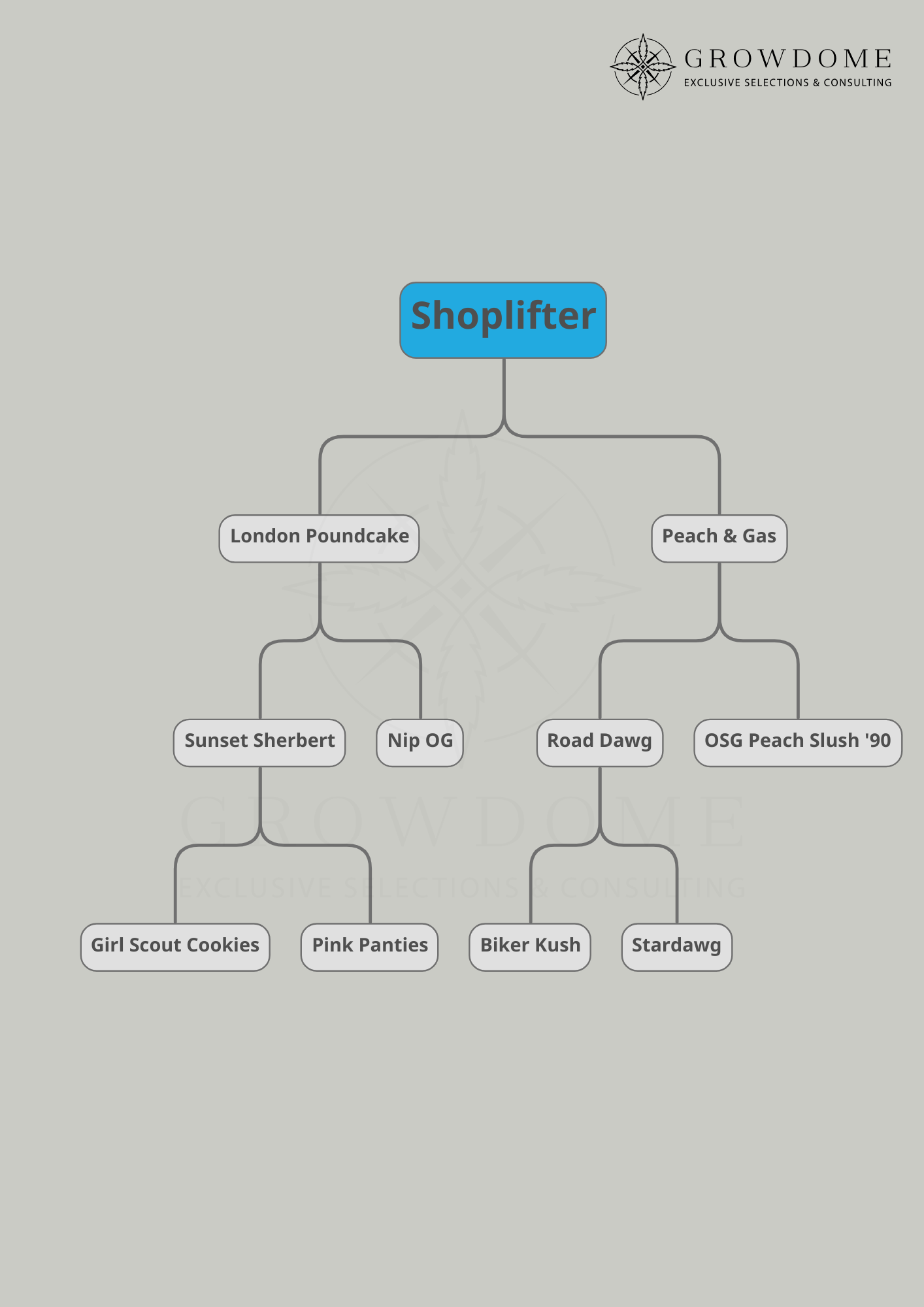Shoplifter is the result of two modern, high-caliber genetics: London Pound Cake meets Peach and Gas . This combination unites sweet, creamy dessert notes with deep Kush and gasoline aromas—a cultivar that impresses both in terms of flavor and structure. Primarily developed for discerning indoor growers, Shoplifter can also demonstrate its strengths outdoors in stable conditions. The genetic lineage brings with it a moderate structure, balanced Indica dominance (60/40), and medium-tall growth—perfect for those seeking the best of both worlds.