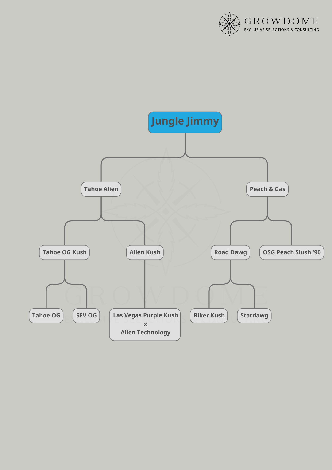 Jungle Jimmy ist eine kraftvolle Kreuzung aus Tahoe Alien und Peach and Gas. Mit einer starken Indica-Dominanz sorgt dieser Genetik für entspannende und beruhigende Effekte. Jungle Jimmy hat eine Blütezeit von etwa 8 Wochen und zeigt eine mittlere Größe sowie ein mittleres Verzweigungsverhalten. Die einfache Handhabung macht ihn besonders für Anfänger im Anbau attraktiv, die dennoch eine starke, entspannende Wirkung erzielen möchten.